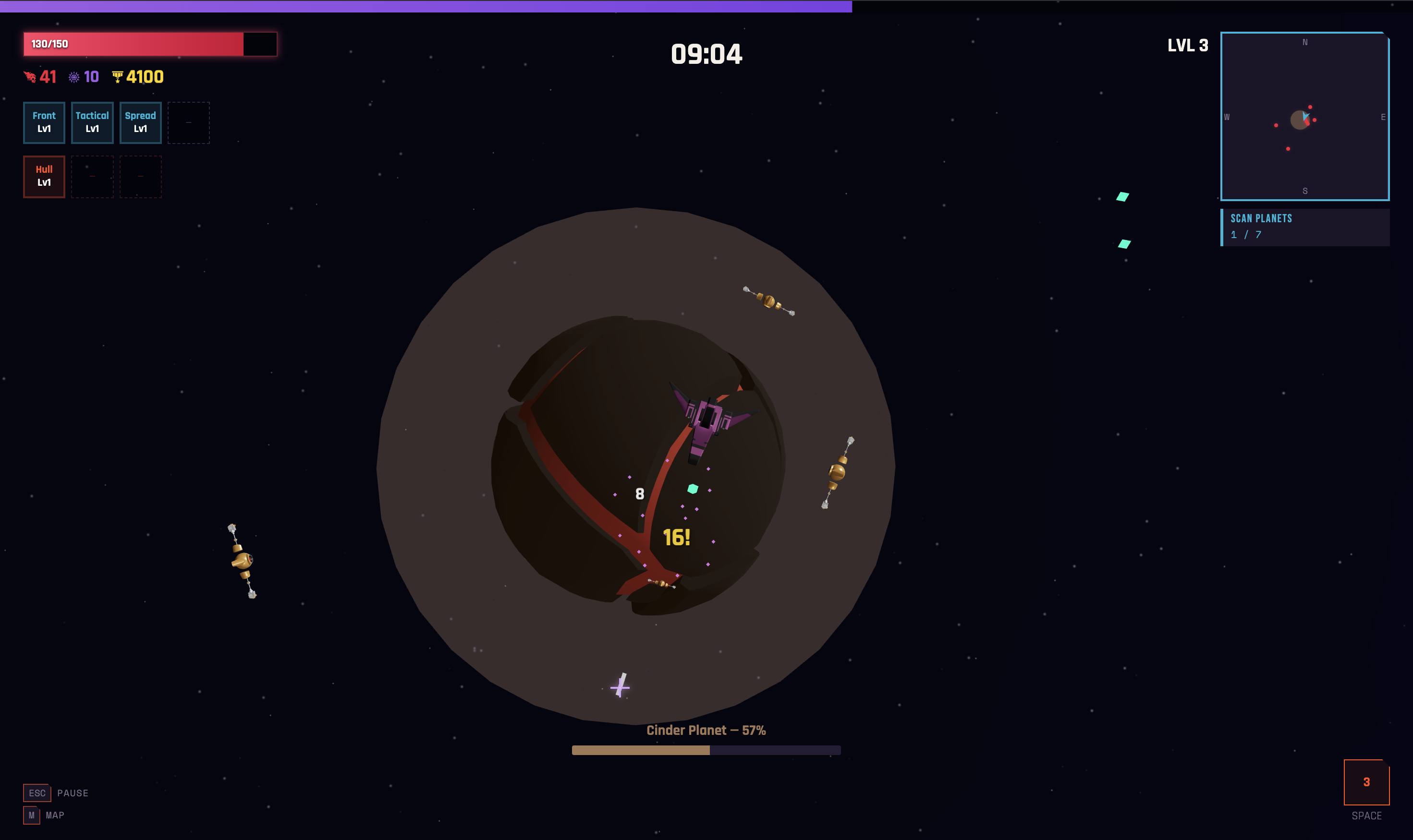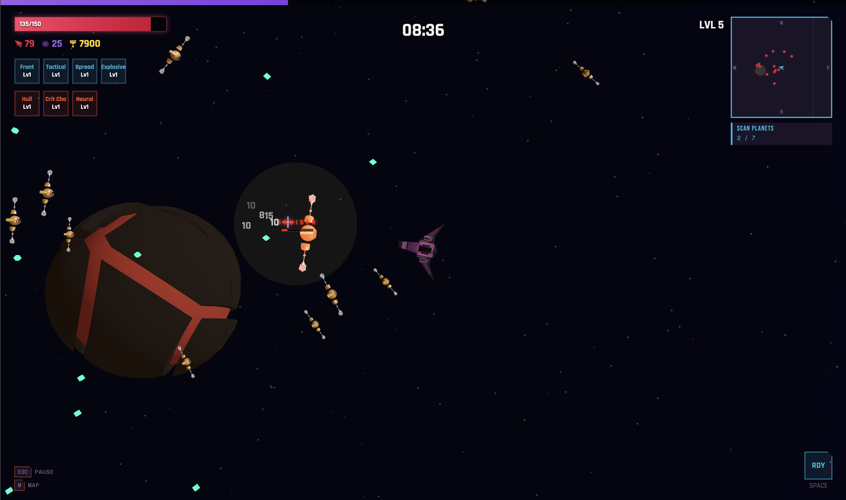 Explore. Scan planets scattered across each system to unlock the exit wormhole. Each scan rewards you with new weapons or powerful items.