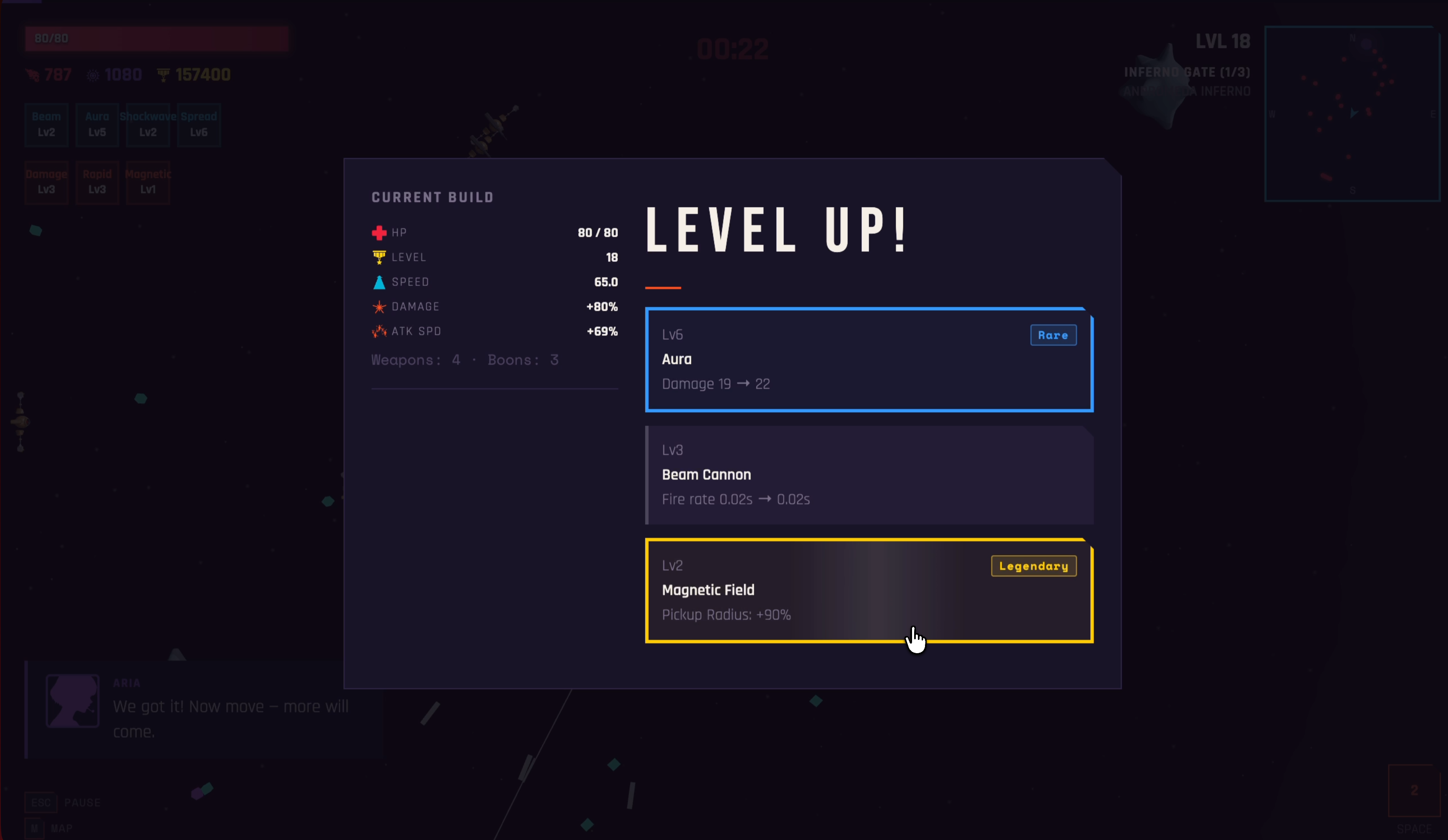 Survive. Level up by collecting XP orbs and choose from 12 passive Boons (damage, speed, crit, regen, armor…) with rarity tiers that stack across the run.